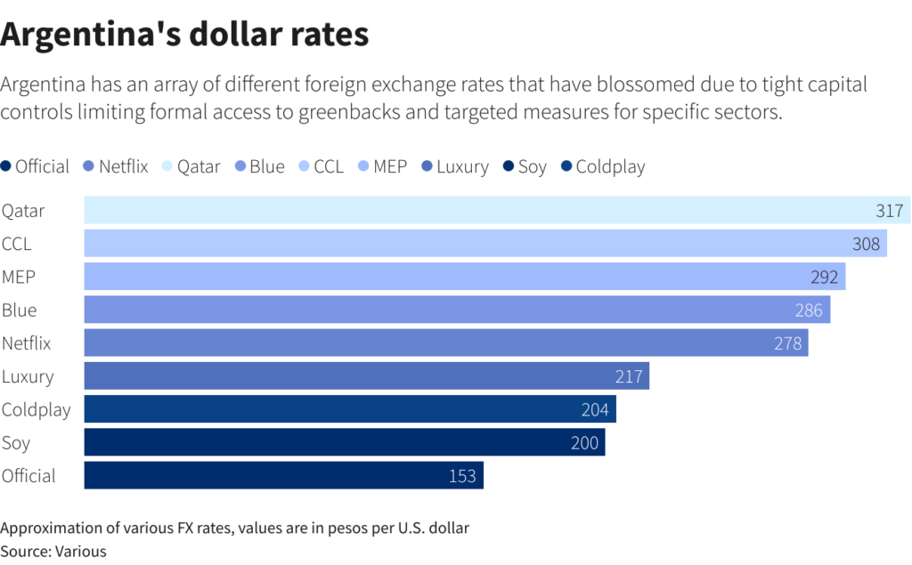 Some have popped up more organically: a so-called "Coldplay" dollar for paying sports stars or music performers in the country. The British band is performing ten concerts later this month. A "Netflix" dollar, meanwhile, refers to a rate elevated by various taxes on overseas streaming services.